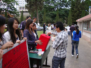申请得到了多方部门的批准及热心帮助。4月19日,一场名为“祈福——今天我们都是玉树人”的爱心募捐活动与昆师路校区正式发动。活动一开始便得到广大师生热情响应。场面十分热闹,募捐箱前更是来往不绝,大家纷纷慷慨解囊,以表示对玉树同胞的关怀和爱心。