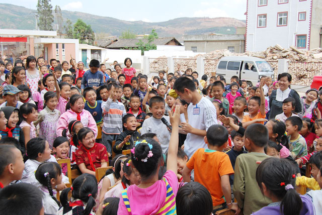 | 学前系部分党团员师生代表顶着烈日,于5月18日中午,来到昆明市桃园小学组织了一次“心手相连、爱心捐助”联欢活动。桃园小学600余名师生参与了本次活动。
