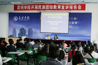 我院为全面贯彻落实省委宣传部《关于组织全省民族团结宣讲活动的通知》精神,根据《中共云南省委高校工委办公室关于协助开展全省民族团结宣讲活动的通知》(云高工办[2010]9号)的安排,结合学院实际,诚邀省委宣传部宣讲团成员、云南省民族事务委员会政策法规处杨剑波处长于4月30日下午到我院作“beat365英国官方网站民族团结教育宣讲报告会”。报告会由学院党委宣传部张立新部长主持,学院组织部、宣传部、统战部、学生处、团委、各相关教学系的党总支书记(副书记)、辅导员和学生代表聆听了报告。