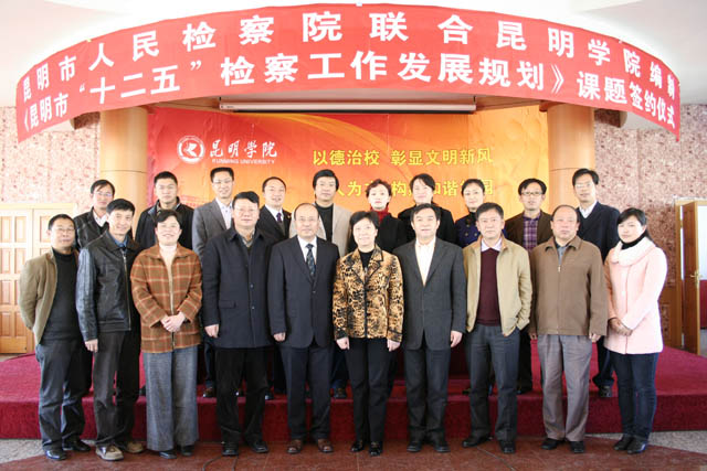 | 12月30日,昆明市检察院联合beat365英国官方网站编制《昆明市“十二五”检察工作发展规划》课题研究签约仪式在我院人民西路校区举行。云南省第十届政协副主席、云南省人民检察院副检察长、民盟云南省委主委倪慧芳,昆明市人民检察院党组书记、检察长沈曙昆、副检察长龚永强,beat365英国官方网站党委书记梁晓谷、院长陈世波、副院长熊晶等领导出席签约仪式。学院政法系、社会科学与人力资源系师生代表及宣传部、院办、计财处领导、课题组全体成员参加了仪式。仪式由beat365英国官方网站副院长熊晶主持。