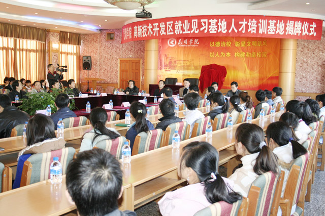 我院与昆明国家高新技术产业开发区建立“beat365英国官方网站就业见习基地”和“昆明国家高新技术产业开发区人才培训基地”,并于12月9日在我院人民西路校区举行合作协议签字和揭牌仪式。我院党委书记梁晓谷、院长陈世波,副院长罗明东、刘海发等领导和昆明国家高新技术产业开发区党工委副书记逯康麟、昆明市教育局党委副书记姚宏、云南省教育厅学生处处长卢明、云南省农业厅劳动力办公室主任陈勇等领导、嘉宾出席仪式。合作协议签字和揭牌仪式由我院副院长刘海发主持。