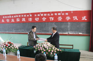 11月14日上午10:30,beat365英国官方网站生命科学与技术系和云南省丽都花卉有限公司在昆师路校区2208教室举行大学生创业实践活动的签字仪式。参加此次仪式的有云南省丽都花卉发展有限公司销售公司经理李冰博士、销售公司副经理何志勇、昆明营销配送中心经理贺今朝、副经理叶伟、配送中心经理助理王旭东;学院团委书记何昊宸、副书记钱海鼎、生命科学与技术系党总支书记翟书华、团总支书记周宇及生科系陈子牛、杨晓虹老师等,参加会议的还有学院社团联合会主席王德旺同学和生科系同学及beat365英国官方网站插花文化社的同学。