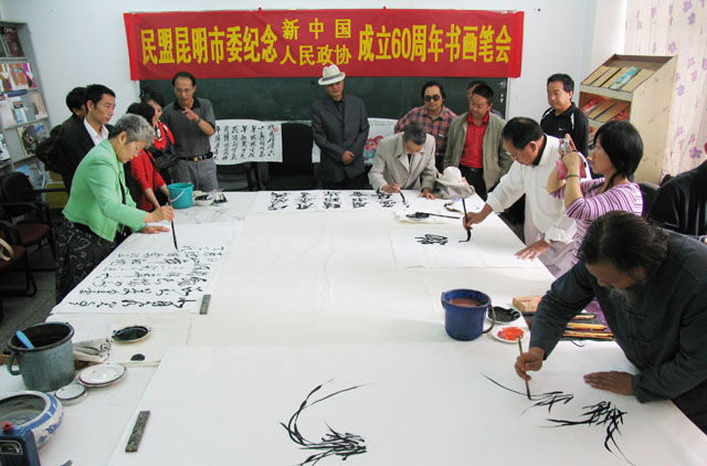 为庆祝新中国和政协成立60周年,表达民盟昆明市盟内书画艺术家的爱国情怀,展示民盟昆明市盟内书画艺术家的书画艺术,切磋盟内书画艺术家们的创作技艺,由民盟昆明市委组织的“庆祝新中国和政协成立60周年书画笔会”于8月20日在我院美术与艺术设计系举行。 省政协委员、民盟云南省委常委、民盟省委文教专委会主任、云南艺术学院副院长潘红教授,云南省社会服务部部长薛继光,中共昆明市统战部党派处处长万绍斌,民盟昆明市委副主委张惠椒、冯刚,民盟昆明市委秘书长周群,云南画院画家杨正国以及盟内书画艺术家黄片石、武新文、朱仲元、王树华等领导和书画艺术家应邀出席了本次书画艺术笔会。应邀出席本次书画艺术笔会的还有民盟云南省委、民盟昆明市委机关的干部、我院党委统战部长、美术与艺术设计系主任和部分师生、社区干部20余人。 潘红教授和张惠椒副主委先后在会上发表了热情洋溢的讲话,鼓励书画艺术家们以庆祝中华人民共和国成立60周年和政协成立60周年为契机,用自己的丹青画笔抒发爱国主义情怀,发挥书画艺术在陶冶情操、构建和谐社会中的重要作用。 随后,书画艺术家以匠心独运的风格和十分流畅的笔墨创作了30余幅书画作品,以书画形式浓墨重彩歌盛世,受到了在场的领导和师生的赞扬和好评。 本次书画艺术笔会在我院举行,加深了省市盟内书画艺术家对beat365英国官方网站的了解,促进了院内外书画艺术家的友谊,对提升beat365英国官方网站美术专业的教学水平必将产生积极的推动作用。