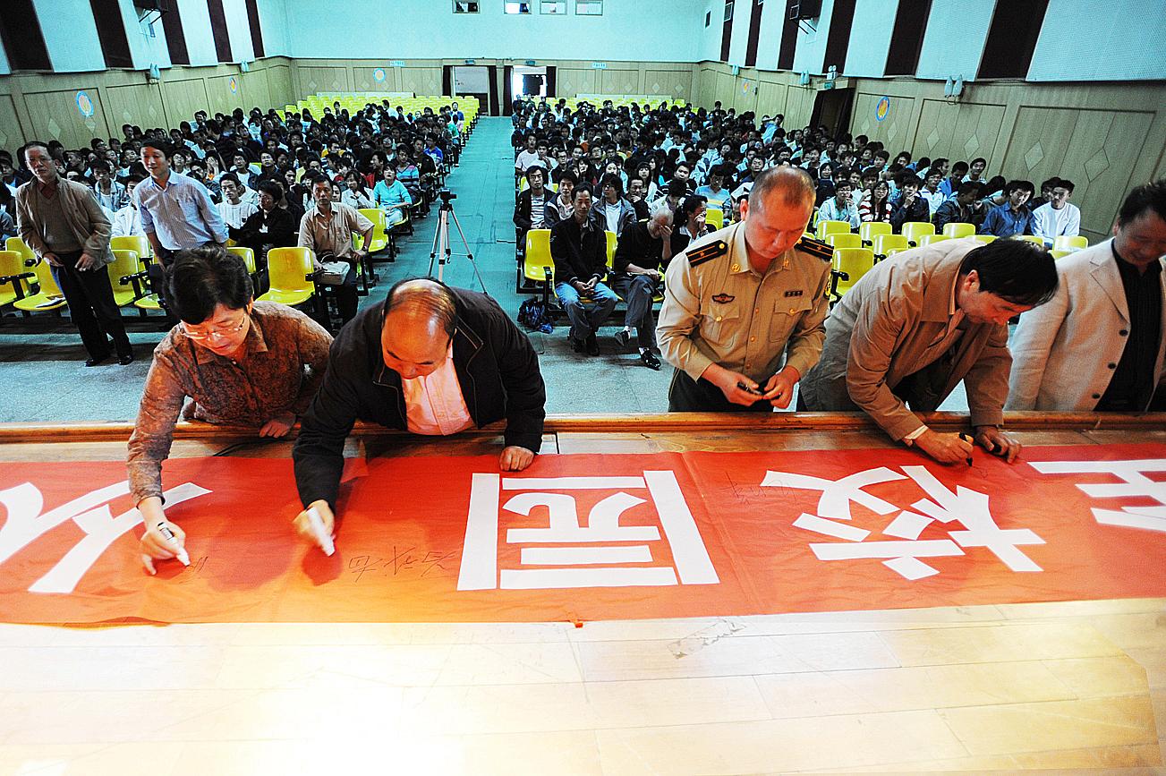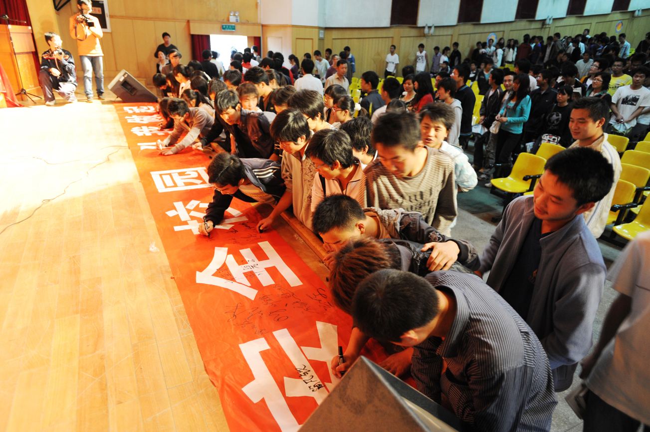 最后,出席启动仪式的领导、嘉宾同校区师生一道在“安全校园,从我做起”的布标上签名。