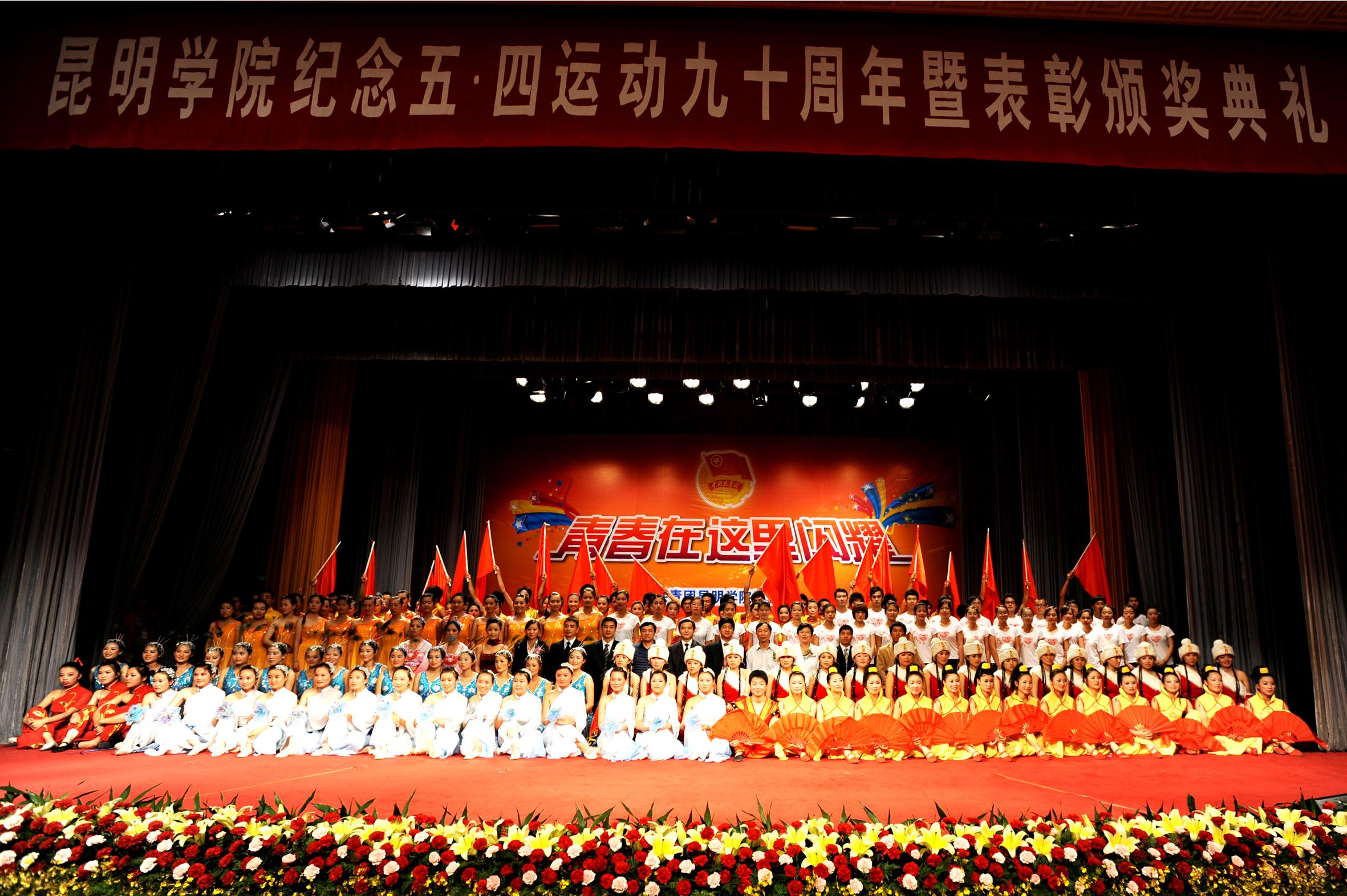 表彰会后,院领导、嘉宾登台与演职人员合影留念,beat365英国官方网站“青春在这里闪耀”纪念“五· 四”运动90周年暨表彰颁奖典礼圆满结束。