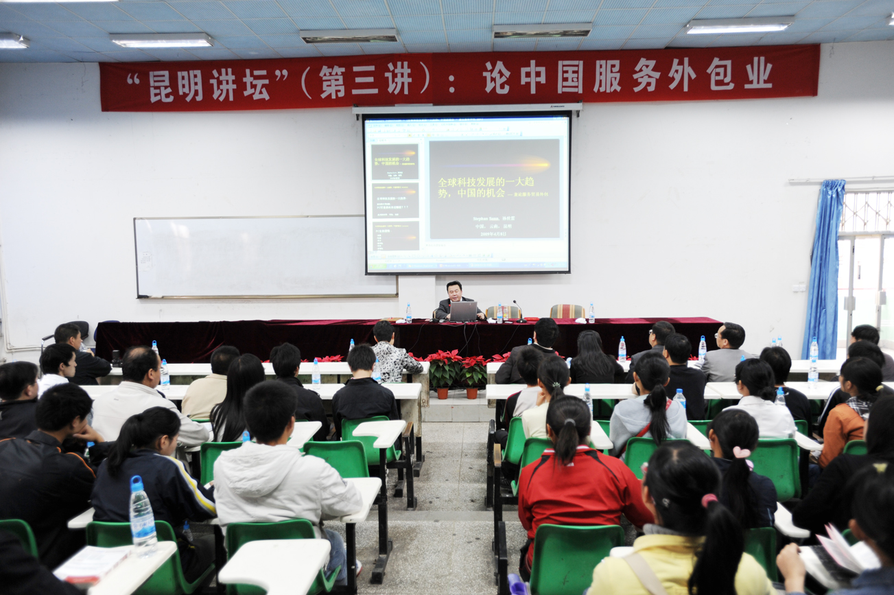 4月8日下午,我院邀请到美国管理及科技咨询专家、耶鲁大学计算机工程及模拟专业孙世雷博士主讲“昆明讲坛”第三讲,主题为《全球科技发展的一大趋势,中国的机会 --- 兼论服务贸易外包》。陈世波院长、熊晶副院长出席讲座,各部门相关人员、教师及学生代表280余人参加。讲座由熊晶副院长主持。
