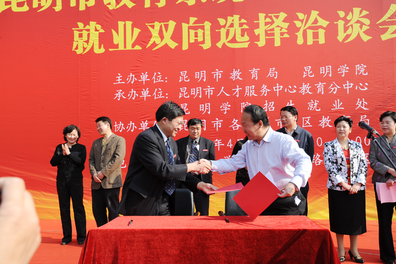 洽谈会启动仪式由熊晶副院长主持。昆明市教育局局长蔡杰和我院孙勇副书记分别致辞,陈院长宣布活动仪式开启。启动仪式上,罗明东副院长代表学院与市教育局蔡杰局长签订了“支教实习”协议书。