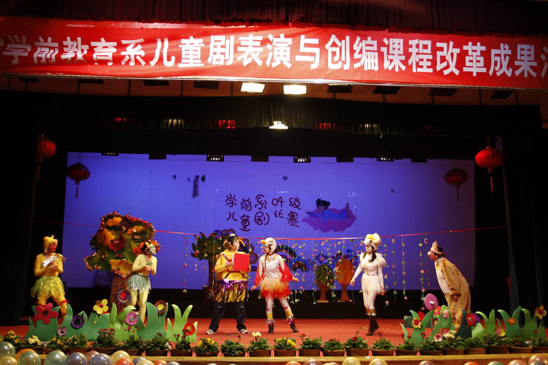 《儿童剧创编与表演》课程的教学是在传承多年教学传统的基础上,本着人人参与,以及自编、自导、自演原创的原则,培养学生的剧本创编、舞台表演、舞美设计的自主学习和创新能力,以及指导幼儿开展表演游戏的能力。同时,也为学生搭起一块展示综合素养和技能的平台,在学前系已形成一种特有的校园文化现象。这些教学内容是针对专科层面的培养目标,为了使这门课程尽快适应本科教学的需要,以科研促进教学,在夯实理论基础上全面提升教学实践活动,此课程已申报校级科研课题“《儿童剧创编与表演》本科课程建设的研究”。目的是在这一独特的领域作更新、更深入的研究,使之真正成为beat365英国官方网站的一门优势学科。
