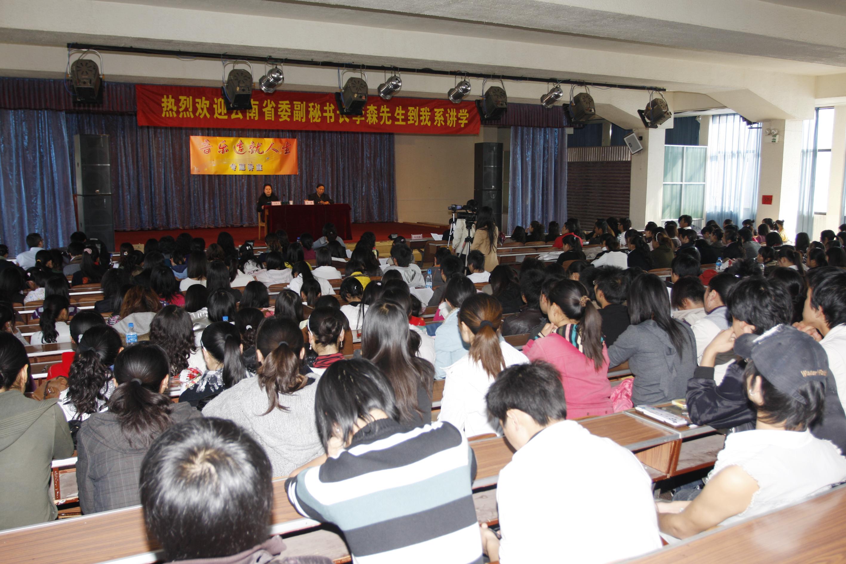 2008年11月14日下午,应我院音乐系邀请,中共云南省委副秘书长李森先生到我院龙泉路校区作了题为《音乐成就人生》的专题讲座。这次讲座是音乐系为贯彻院党委关于切实加强师生思想政治工作的要求,努力提高广大师生的综合素质而举行的。讲座得到了院领导的重视和支持,部分院领导和音乐系全体师生参加了此次讲座。讲座由音乐系负责人靳丽芬教授主持。