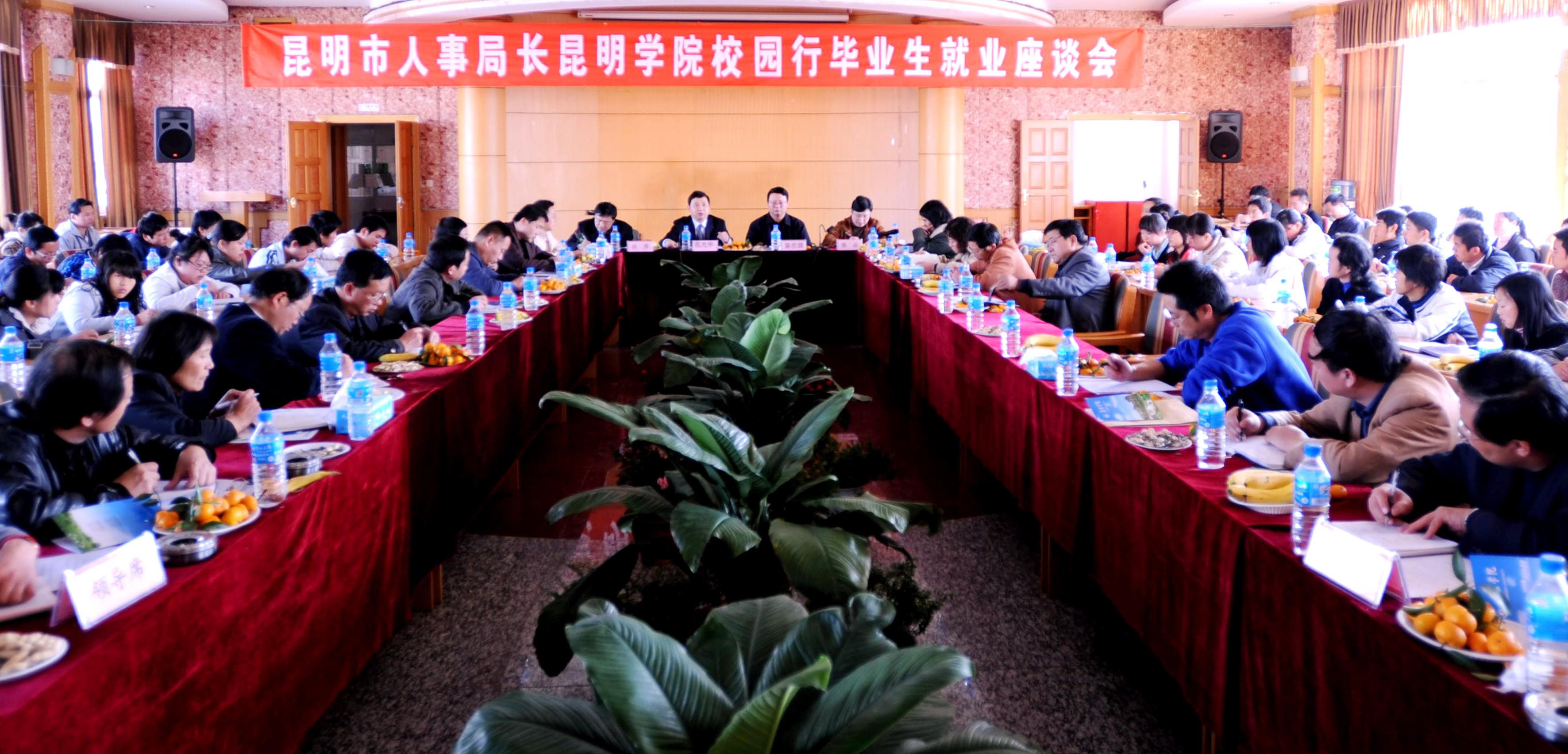 应我院邀请,昆明市委组织部副部长、市人事局局长、市劳动和社会保障局党组书记范光华同志11月25日下午走进我院,在人民西路校区与我院领导和师生进行座谈。陪同范光华局长走进校园的有,昆明市人才服务中心马必成主任、昆明市人才服务中心佟良副主任、昆明市人事局办公室龚成杰副主任、昆明市劳动就业服务局张万聪副局长、昆明市人才市场辛继龙副主任、昆明市职业介绍中心邢磊副主任。出席座谈会的学院领导有陈世波院长和孙勇副书记,各系党政领导、学生代表和学生处及有关部门工作人员共120余人参加了座谈,熊晶副院长主持座谈会。
