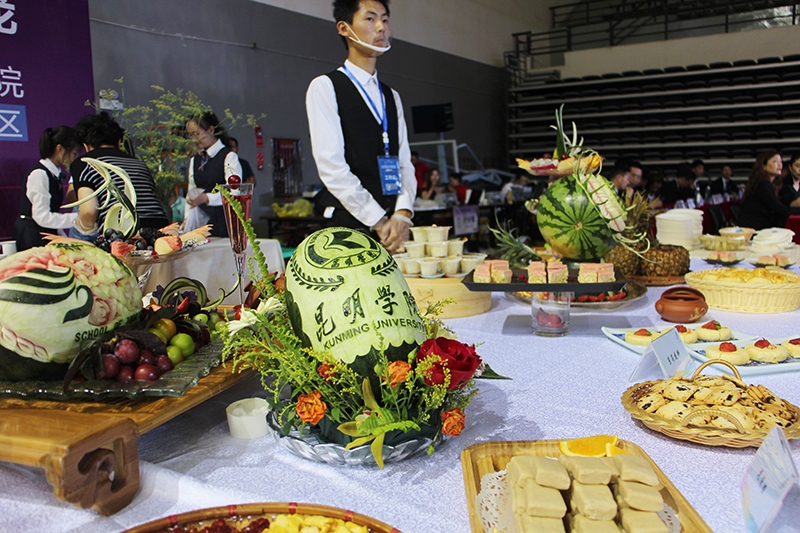当晚比赛结束后,大赛组委会还举行“体育舞蹈沙龙”活动,邀请与会领导、嘉宾、裁判组、竞赛组、明星选手等出席,鉴赏beat365英国官方网站旅游学院、美术与艺术设计学院学生分别带来的专业技能茶艺、果盘设计、酒水、冷餐和刺绣、雕刻、瓷器等手工艺术品,并进行相关文化交流。