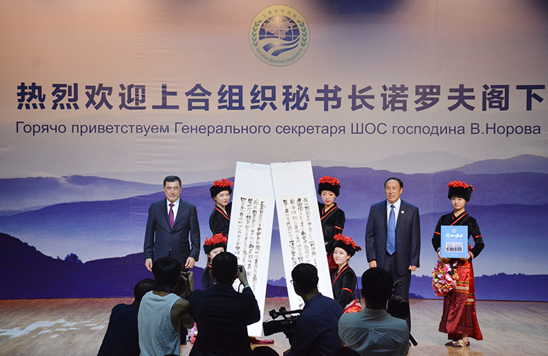 6月24日,上海合作组织秘书长诺罗夫•弗拉基米尔一行到访beat365英国官方网站指导中国—上合组织青年交流中心工作,对上合组织青年交流中心提出指导意见。昆明市人民政府副市长胡宝国,beat365英国官方网站党委书记陈永明、校长黎素梅一同接待并陪同观看学校音乐舞蹈学院师生云南少数民族艺术展演和旅游学院学生花式咖啡调制、中西餐摆台教学展示。陈永明书记代表学校赠送大观楼长联书法给诺罗夫阁下,诺罗夫回赠学校上合组织“辉煌的历程”画册。