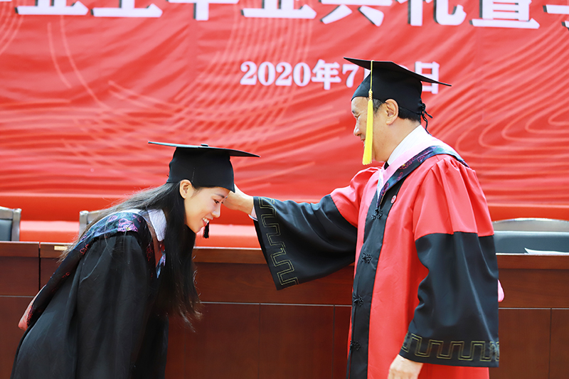 副校长王凡宣读《beat365英国官方网站关于审定2020届全日制本专科毕业生毕业资格和授予学士学位的决定》。与会领导为毕业生代表及外国留学生颁发毕业证书,祝贺他们圆满完成学业顺利毕业。在学位授予仪式上,陈永明书记身着导师服,庄重地为每一位毕业生代表扶正流苏,授予学位。