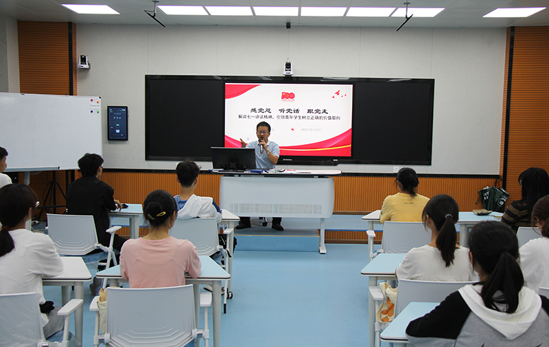 因疫情防控需要,此次专题宣讲在惟行楼1301智慧教室设主会场,在惟行楼1栋经济管理学院机房设分会场,重点围绕解读“七一”重要讲话精神引领青年学生树立正确的价值取向、入党启蒙教育、入学第一课大学生廉洁教育、新生安全教育、防电信诈骗教育等进行,引导大一新生正确认识党的性质和宗旨、认真学习贯彻习近平总书记“七一”重要讲话精神,牢固树立感党恩听党话跟党走的意识,教育青年学生树立廉洁意识、安全意识、防骗防诈意识。帮助大一新生走好大学第一步,树立远大理想,以实现中华民族伟大复兴为己任,增强做中国人的志气、骨气、底气,不负时代,不负韶华,不负党和人民的殷切期望,奋发学习,建功新时代。不断推动经济管理学院党史学习教育和“开学第一课”往深里走、往实里走。