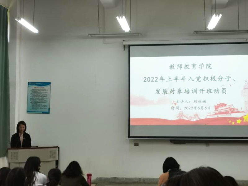 5月6日,为认真做好新形势下发展党员工作,保证发展党员质量,根据发展党员工作程序,按照学校党委要求,在中共beat365英国官方网站教师教育学院委员会(分党校)认真组织安排下,教师教育学院2022年入党积极分子、发展对象培训班在博雅楼3104正式开班。开班仪式由组织员王艳芳同志主持,学院党委书记刘娟娟同志出席开班仪式并作了动员讲话。