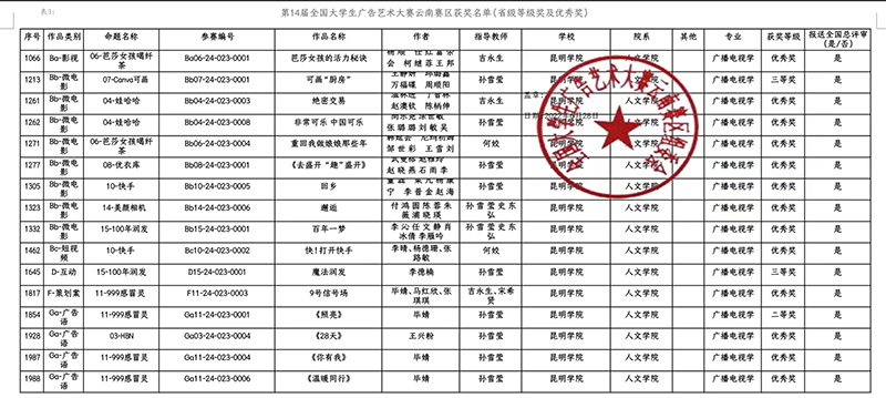 近日,第十四届全国大学生广告艺术大赛(以下简称大广赛)暨第十三届云南省大学生广告艺术大赛云南赛区评审结果公示,我院广播电视学专业参赛学生一举荣获16个奖项,包括二等奖1项、三等奖2项、优秀奖13项。这是我院广播电视学专业近年参加云南省大广赛取得的最好成绩,为学院和本专业再添荣誉。