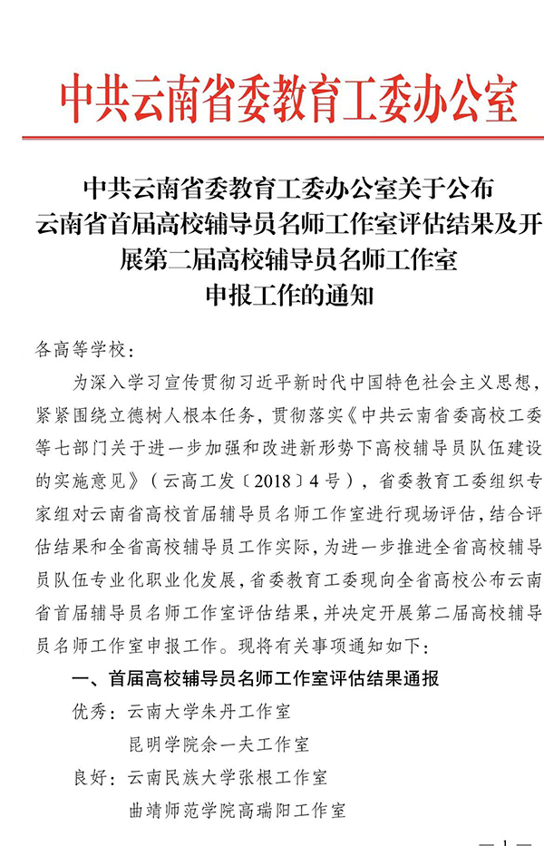 为深入学习宣传贯彻习近平新时代中国特色社会主义思想,紧紧围绕立德树人根本任务,省委教育工委组织专家对云南省高校首届辅导员名师工作室进行现场评估,beat365官网云南省首届高校辅导员名师余一夫工作室在本次评估中荣获优秀。