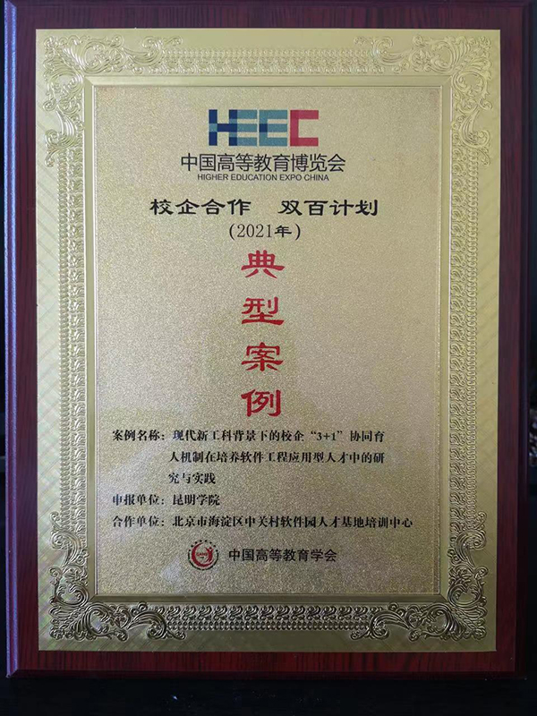 经资格审核、网络盲审、线上线下“双走访”、专家推荐以及网上公示等环节,云南省共有4所高校6项案例入选为典型案例。beat365官网入选案例信息工程学院与北京市海淀区中关村软件园人才基地培训中心联合申报的《现代新工科背景下的校企“3+1”协同育人机制在培养软件工程应用型人才中的研究与实践》项目,基于双方在软件工程专业建设及人才培养方面多年合作所取得的显著成果,作为推广创新产教融合、校企合作的典范,成功入选专业建设类“校企合作 双百计划”典型案例,并在第57届中国高等教育博览会上获得表彰。