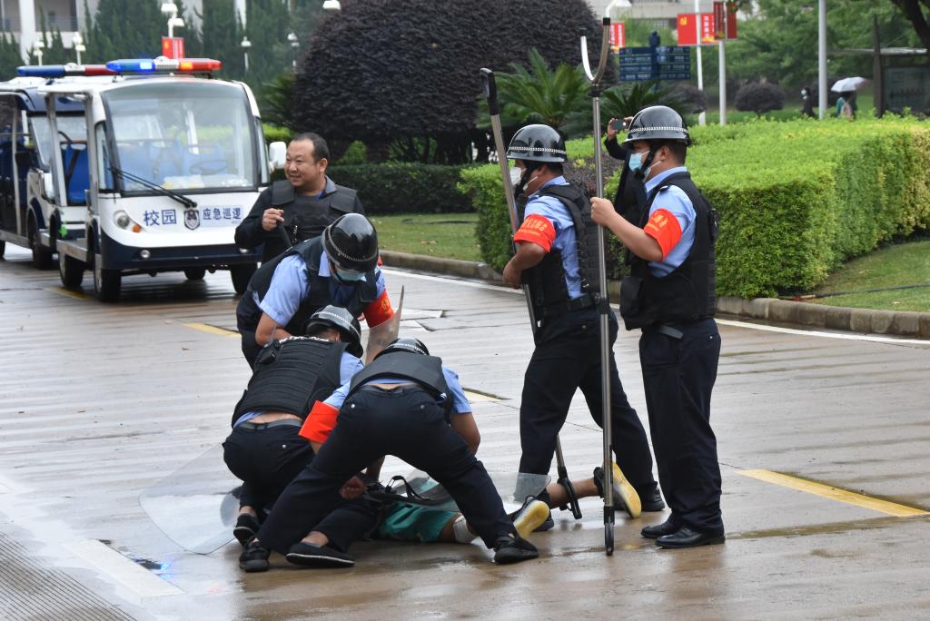 演练现场,各处置组迅速到位,应急处置中队队员持防暴盾牌、防暴叉对暴恐分子形成合围并采取强制措施将其制服,灭火组进行火点扑救,医疗救护组抢救受伤学生,博文楼学生在老师组织下迅速从火场疏散到安全区域,演练顺利结束。
