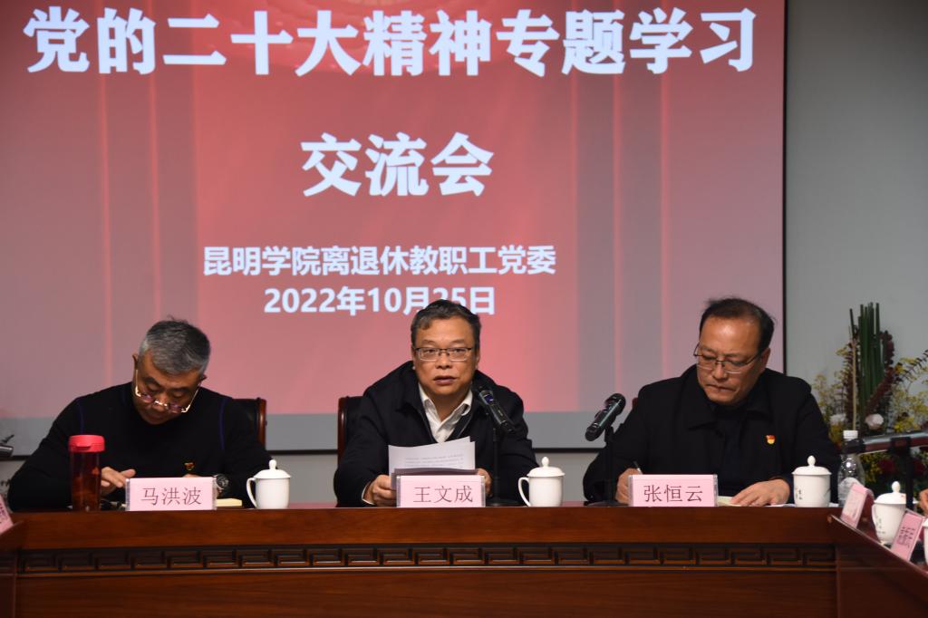 为深入学习贯彻党的二十大精神,加强新时代离退休干部党的建设工作,教育引导广大离退休干部深刻领悟“两个确立”的决定性意义,以实际行动做到“两个维护”,以党建引领新时代老干部工作高质量发展。2022年10月25日,离退休教职工党委举办“学习贯彻党的二十大精神”专题学习交流会。学校党委副书记王文成为参会老同志作主题交流发言,离退休教职工党委书记张恒云主持会议。
