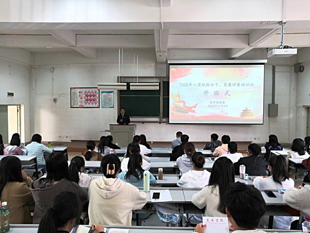 11月4日下午,医学院2022年下半年入党积极分子和党员发展对象培训班开班,医学院党委书记张培宏、副书记李杨及组织员、4个学生党支部书记、支委,入党积极分子和党员发展对象参加。