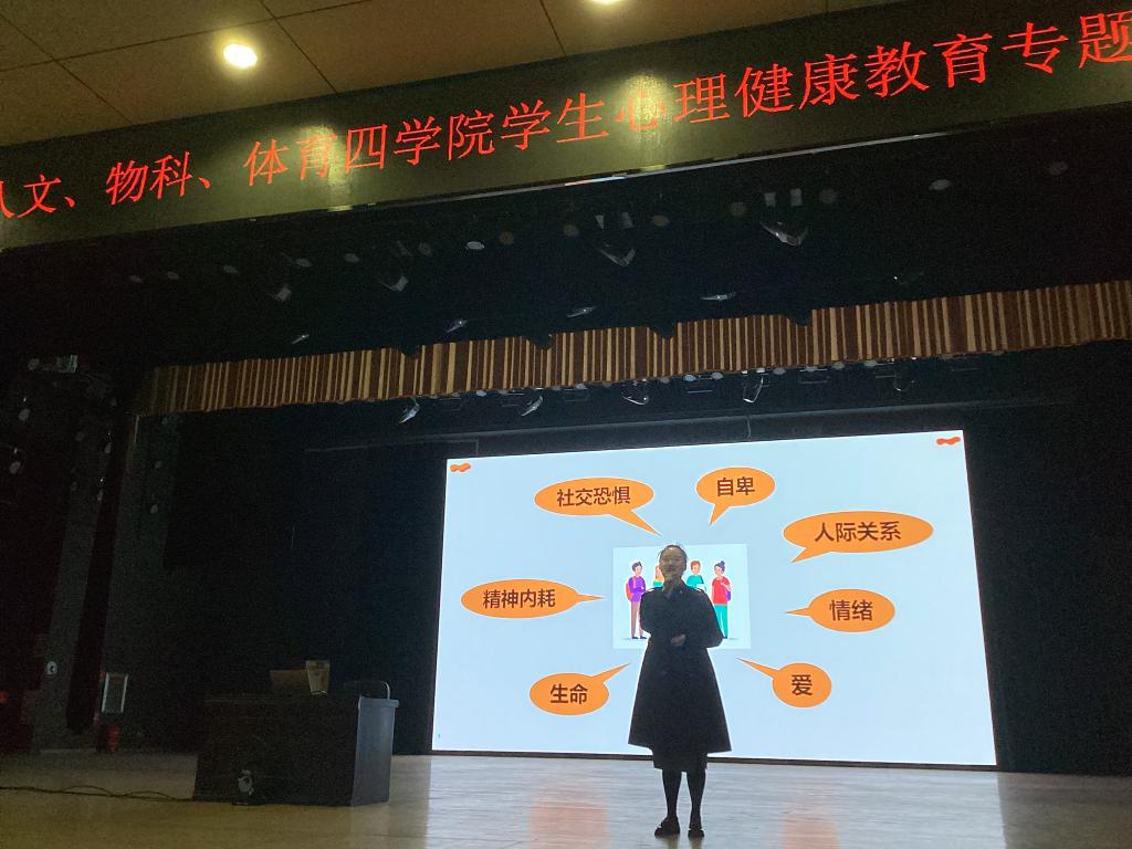 3月24日下午,建筑工程、人文、物理科学与技术、体育四家学院联合举办大学生心理健康教育专题讲座。心理健康教育与咨询中心教师蒋顺一受邀作题为《认识自我,理解自我,重塑自我——给大学生的自我心理建设指南》专题讲授,教育引导学生提高心理健康水平,健全人格发展。