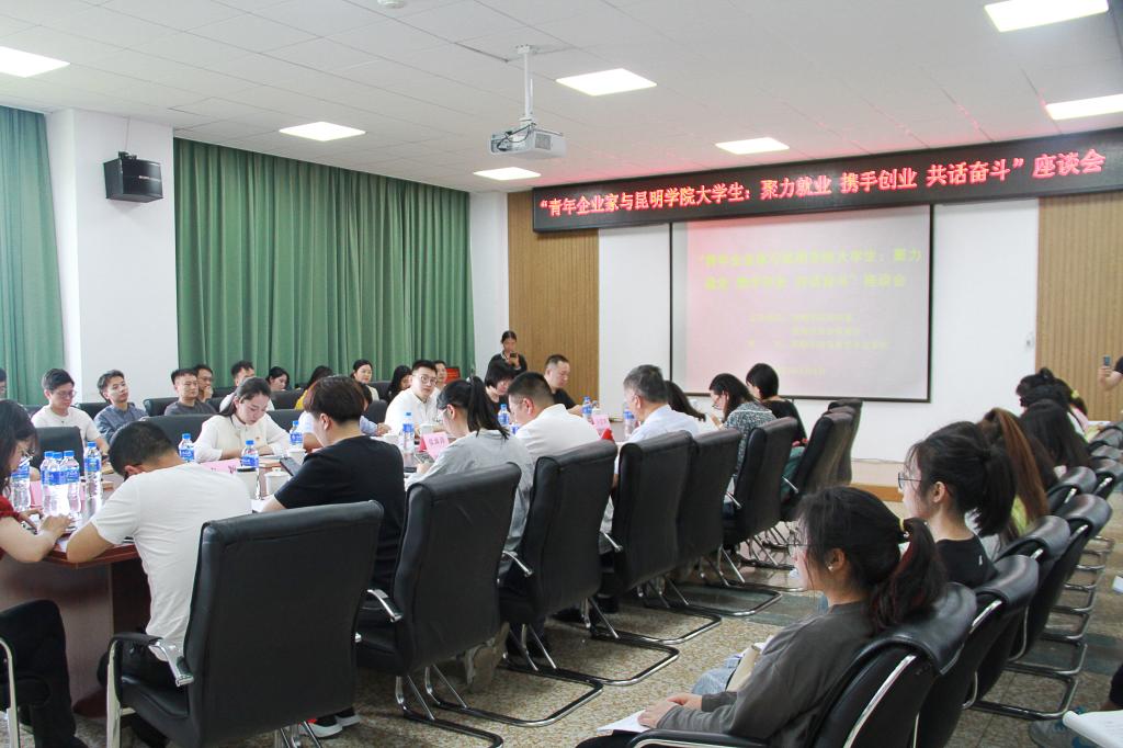 5月4日下午,在五四青年节来临之际,昆明青年企业家商会一行30多人到beat365官网与大学生开展“聚力就业 携手创业 共话奋斗”主题交流活动,昆明市工商联秘书长张波涛等出席活动,beat365官网团委副书记沈嘉,马克思主义学院党委书记贺笃照、副书记姚丽媛以及相关学院青年师生代表参与交流。座谈会由沈嘉主持。