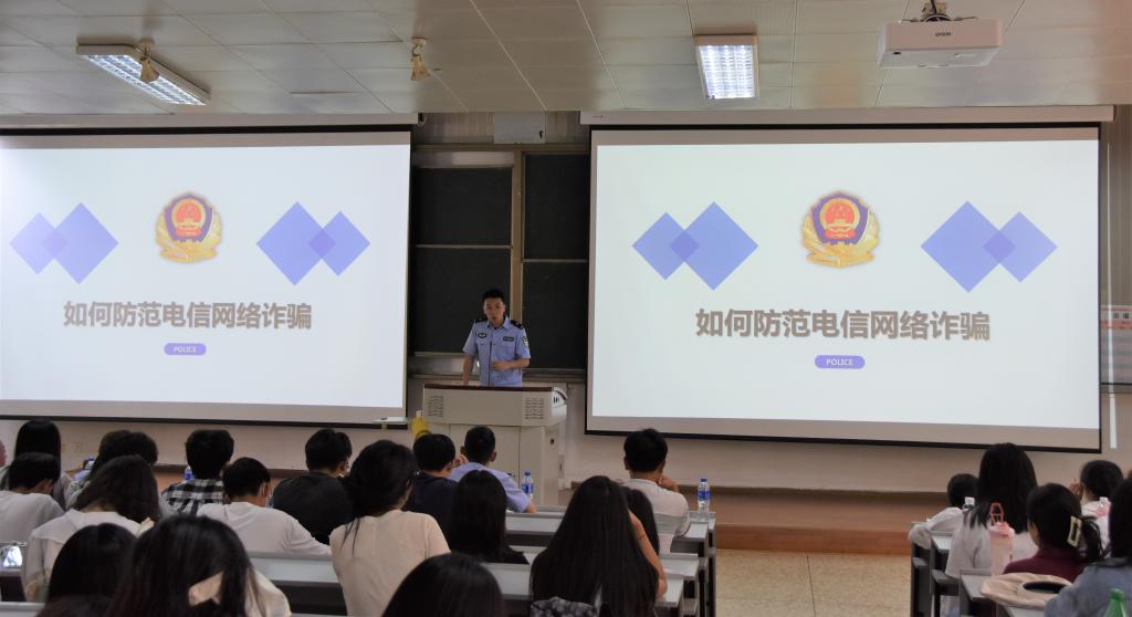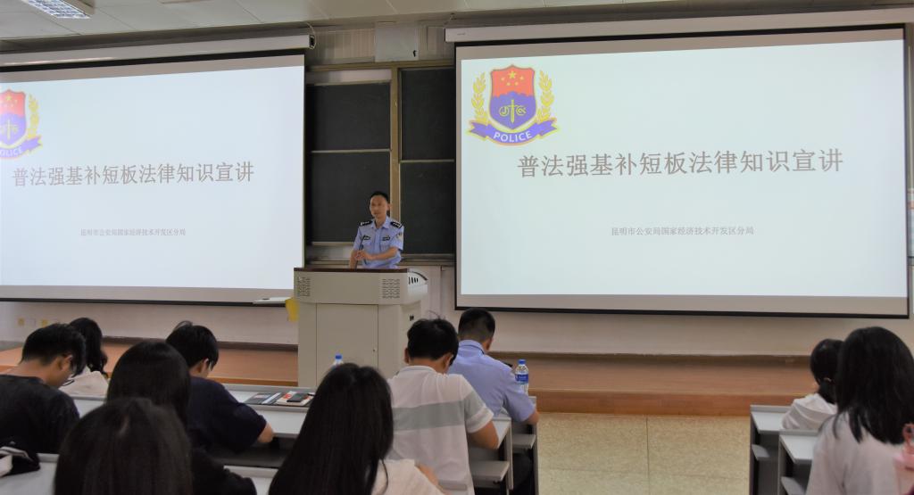 为深入推进普法强基工作,进一步提高在校师生安全法治意识、反电信网络诈骗意识,5月19日,保卫处联合昆明市公安局经开分局在学校举办安全法治教育讲座。