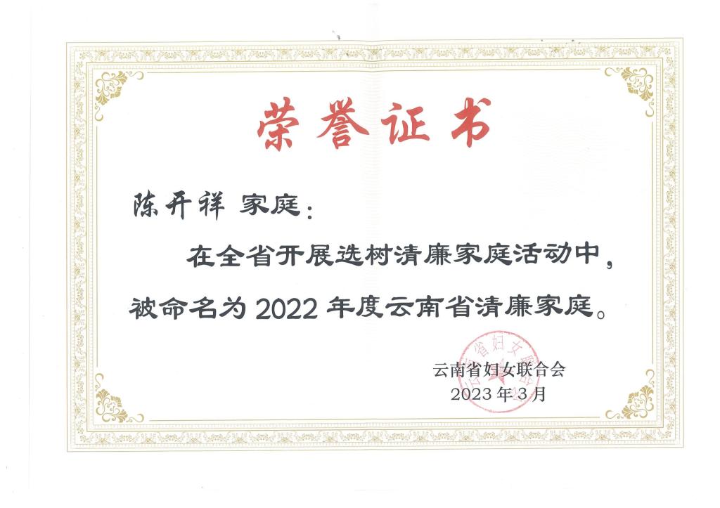 近日,云南省妇联开展的2022年云南省清廉家庭选树活动结果揭晓,beat365官网陈开祥家庭荣获云南省“清廉家庭”称号。