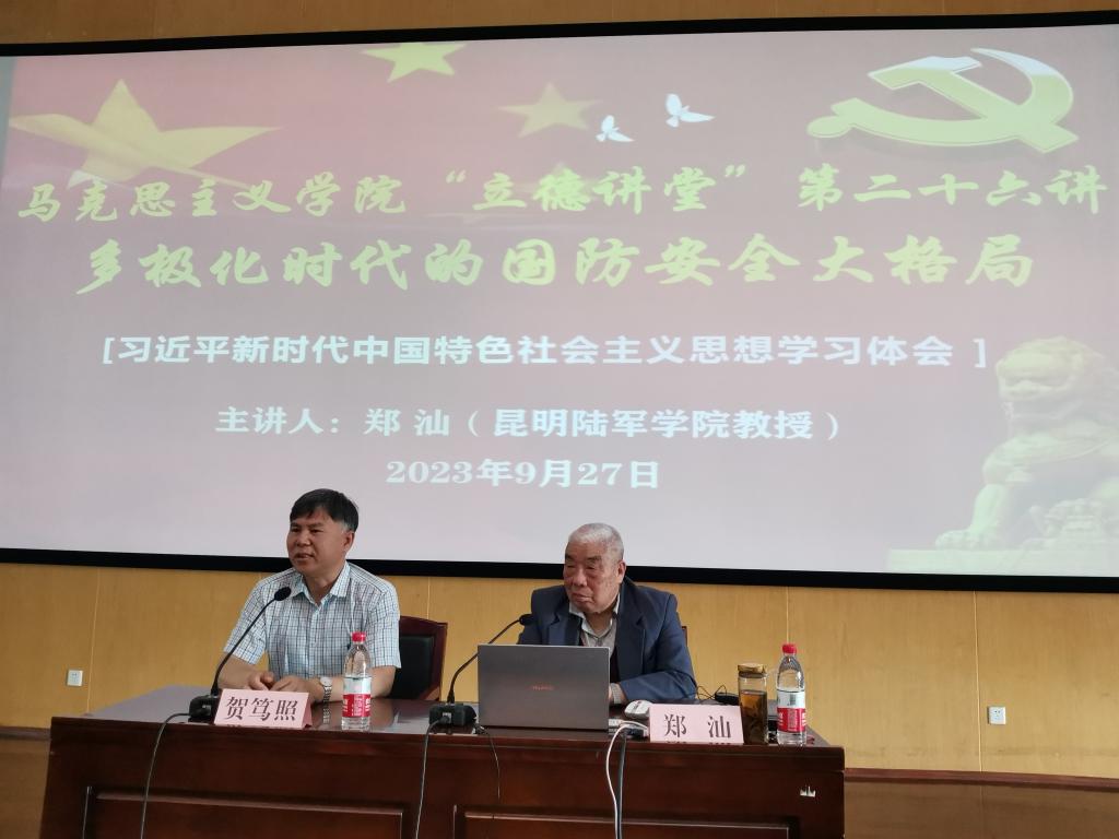 9月27日下午,马克思主义学院举行“立德讲坛”第二十六讲,昆明陆军学院郑汕教授作题为《多极化时代的国防安全大格局》专题讲授,学院党委书记贺笃照主持。