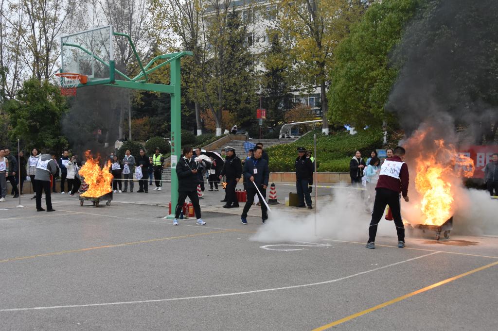 灭火器接力火盆灭火竞赛,参赛队员需手持3公斤灭火器迎面接力,最后一名队员跑向火盆设置点将火盆内的火焰扑灭;消防水带链接竞赛由3名队员将消防水带抛出、拉伸、链接好,一名队员确认水带链接完成后开启消防栓开关,模拟消防栓出水。虽然当天的气温很低,现场的气氛却像火盆里的火焰一样热烈。师生们团结协作、行动快速、准确迅速扑灭火盆内熊熊燃烧的火焰,标准链接水带、正确打开消防栓开关,圆满的完成了竞赛项目。