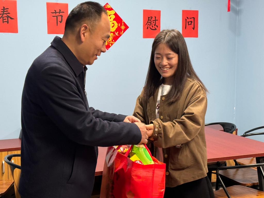 卯兔辞旧,祥龙迎新,在农历甲辰年新春佳节来临之际,beat365英国官方网站开展了2024年春节关爱留校学生慰问活动。2月3日上午,正值中国传统小年,beat365英国官方网站党委委员、副校长郭华带领学生处、后勤集团及农生、医学、数学、体育、国际等二级学院相关领导、老师看望了假期留校的本科生、研究生、留学生并进行了慰问座谈,代表学校向留校学生致以节日问候和良好祝愿并送上福袋礼物。恭祝大家新春快乐,万事顺意,阖家幸福。