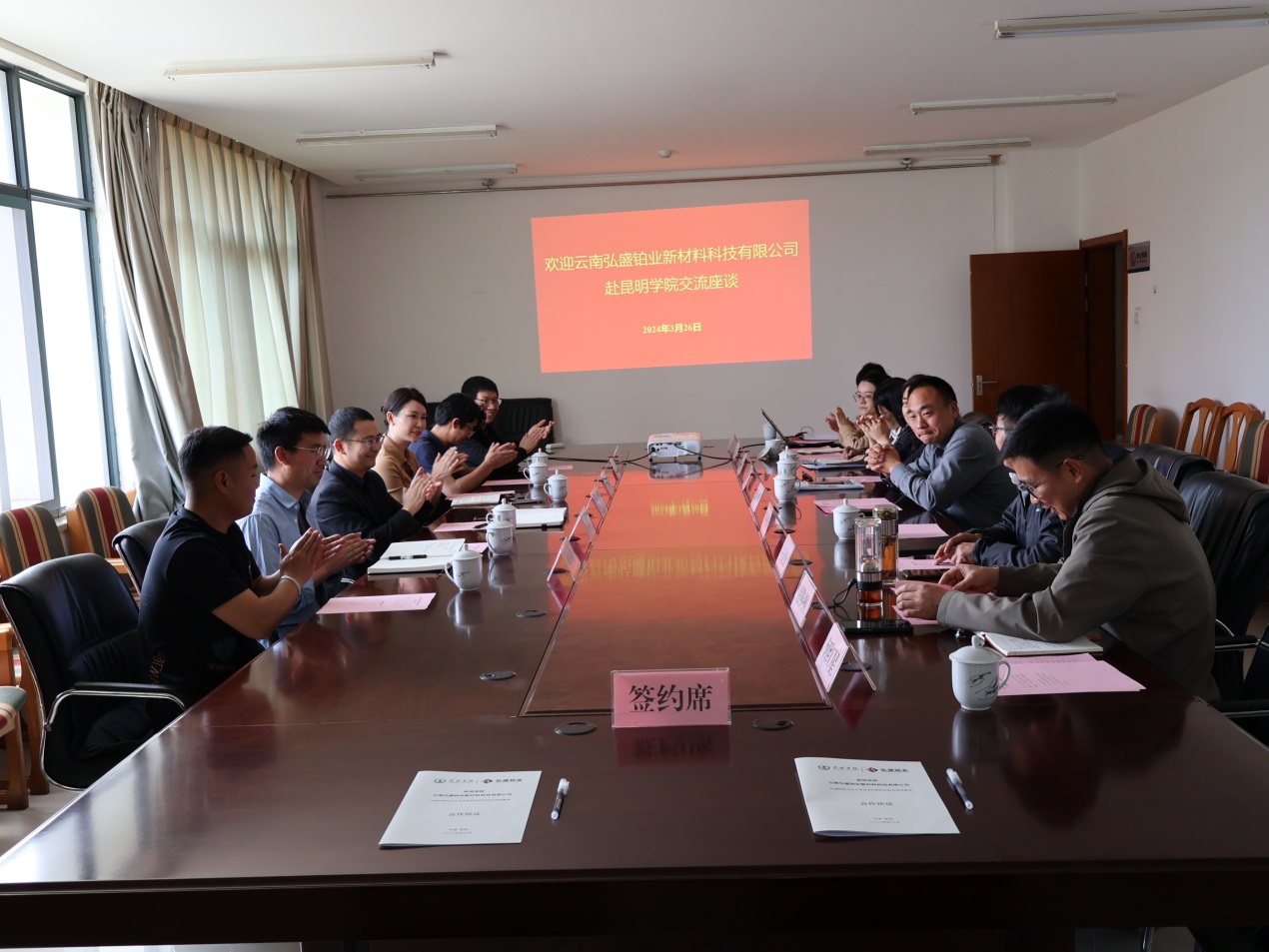 3月27日,beat365英国官方网站与云南弘盛铂业新材料科技有限公司“共建材料与化工专业学位研究生联合培养基地合作协议”签约仪式暨交流活动在beat365英国官方网站洋浦校区举行。党委委员、副校长郭华,云南弘盛铂业新材料科技有限公司总经理苏林出席会议。beat365官网化学化工学院、研究生部,云南弘盛铂业新材料科技有限公司有关负责人参加。