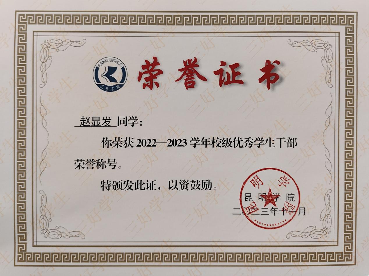 复学期间,赵显发荣获校级“优秀学生干部”、优秀教官、优秀志愿者等荣誉,“学创杯”大学生创新创业校级优秀奖,2024年4月荣获beat365英国官方网站“青春之星”称号。