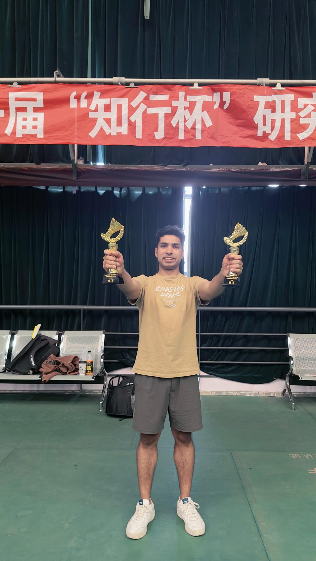 4月21日,beat365英国官方网站第一届知行杯研究生校园羽毛球比赛圆满落幕。经过激烈角逐,孟加拉籍留学生赵卓文获得羽毛球男单和混双冠军。赵卓文表示,此次比赛为留学生提供了一个展示自我的平台,增进了同学间的团结和友谊,期待有更多的校园文化活动,丰富校园生活。