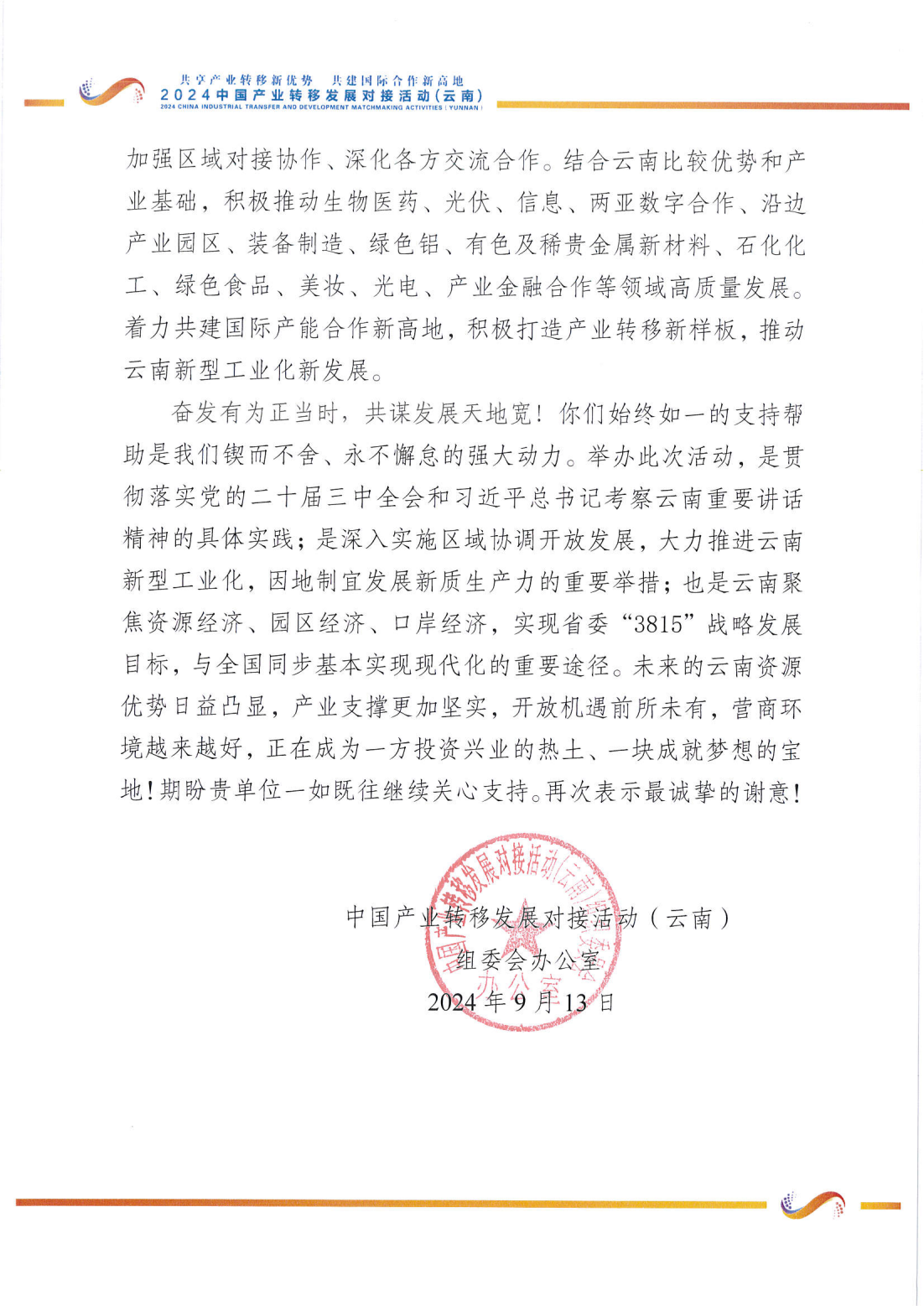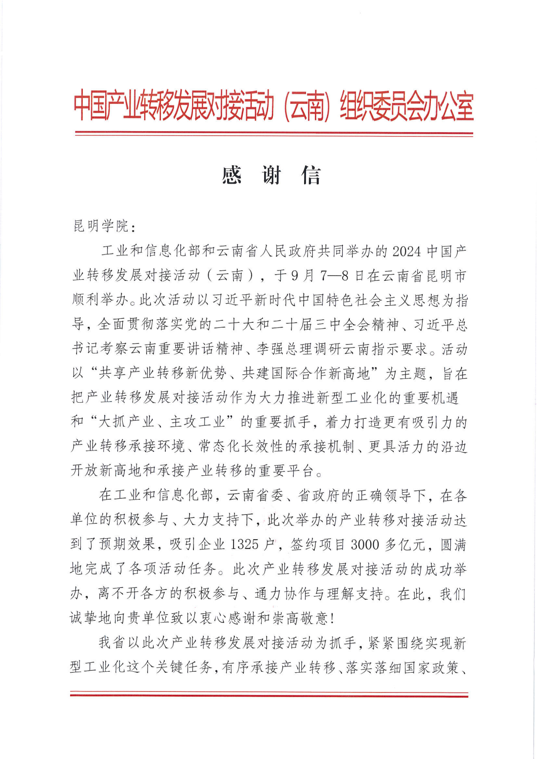 近日,beat365英国官方网站收到中国产业转移发展对接活动(云南)组委会办公室发来的感谢信,就学校在活动举办过程中给予的支持和帮助表示衷心感谢。
