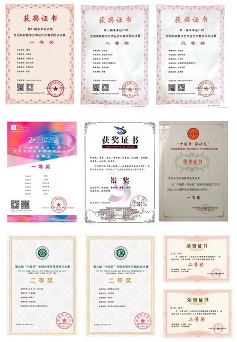 近三年,美术与艺术设计各专业学生参加国际国内专业赛事展览获奖成果丰硕。其中,参加国家级、省级赛事展览600余项,学生学科竞赛获奖 565项。代表性奖项如下:
