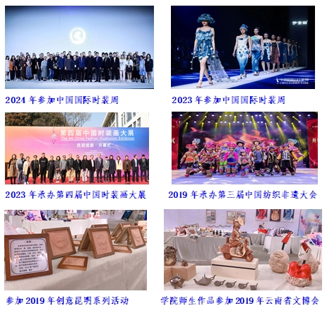 学院对外积极协同社会力量联合育人,与区域内优质企业——云南奥斯迪实业有限公司、中策装饰(集团)有限公司、昆明视方数字印刷责任有限公司、昆明观澜广告公司以及昆明国家广告产业园区内多家企业搭建良好合作关系。采用“真题实练”教学法,把学生实训实习任务紧扣行业企业的岗位技能需求。从2003年与企业共建的“中策课堂”到2023年聘省级产业导师,二十年间,学院始终保持对专业服务行业、人才服务社会的高度关注,也得到地方政府、设计行业的大力支持。近年来,学院借助国家行业协会力量助力学科发展。学院主办、承办和策划连续四届中国时装画大展、第三届中国纺织非物质文化遗产大会等全国性专业赛事展览近10次;师生作品受邀参加国际大学生时装周、云南省文博会、旅交会、茶博会、创意昆明等活动;承办省市“非遗传承人群提升培训项目”等;获得云南省第九届高等教育教学成果二等奖,在产业行业专业赛事中拓展师生专业视野。