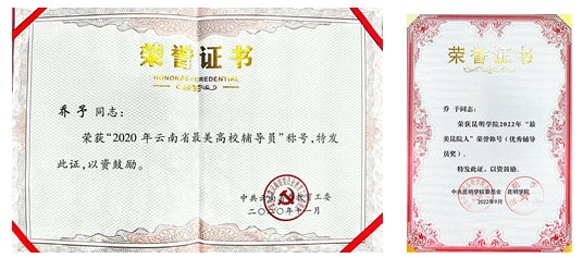 学院辅导员乔予荣获“2020年云南省最美高校辅导员”称号,并获得2022年beat365英国官方网站“最美昆院人辅导员奖”。