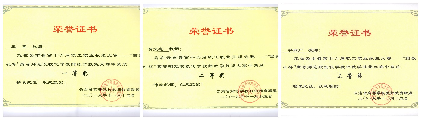自2008年学院开始建设第一个本科专业以来,已建成云南省基础化学教学团队、云南省基础化学实验教学中心、云南省食品药品检验创新试验区、云南省化工工艺安全虚拟仿真实验室、中央财政支持建设化工安全实训中心等教学平台和团队。近五年,教师主持省部级教研项目5项,获得云南省教学成果一等奖1项,云南省教学比赛一等奖2人、二等奖1人、三等奖2人,云南省一流课程2门,校级一流课程11门。