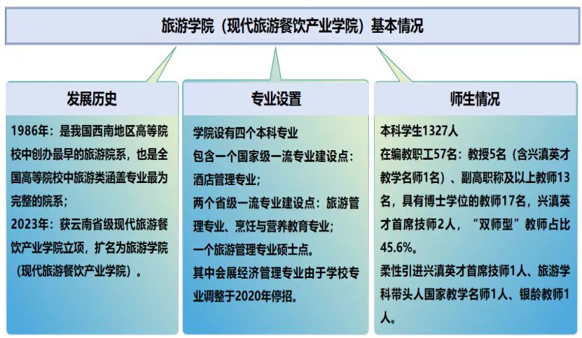 旅游学院始终坚持社会主义办学方向,坚持立德树人根本任务,坚持人才培养中心地位,深化各项改革,打造对接云南旅游产业链,建设特色鲜明应用型本科旅游专业集群,努力将学院建设成为以全日制本科教育为主体、具有区域影响力的旅游应用型本科人才培养基地,云南第一、国内领先、具有区域国际影响力的示范学院。