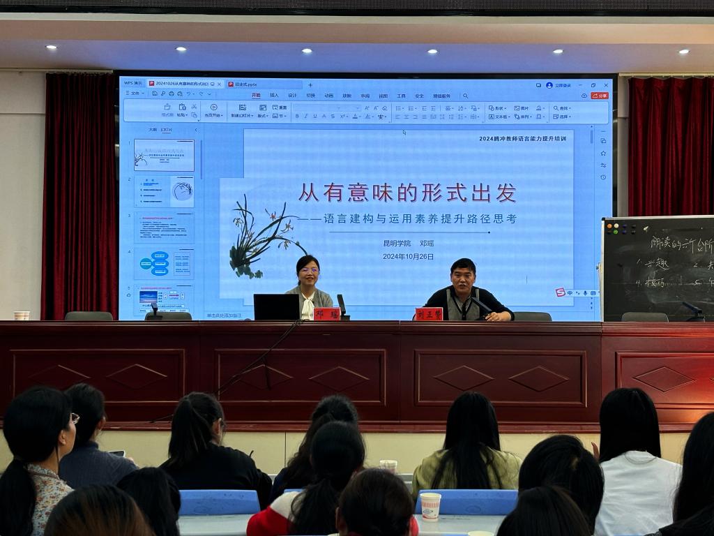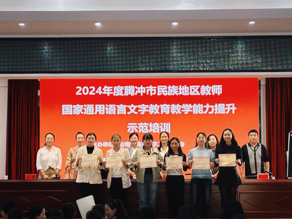 10月26日-27日,beat365官网国家语言文字推广基地教学团队一行5人赴腾冲市,与腾冲市教育体育局共同举办了2024年腾冲市民族地区教师国家通用语言文字教育教学能力提升示范培训。来自腾冲市中小学和幼儿园的100名教师参加了此次培训。围绕参训学员的实际需求和现有普通话水平,培训设置了“普通话测试达标”“教师口语能力提升”与“国家通用语教育教学能力提升专题讲座”三个模块,结合学员在日常教育教学中对普通话的实际运用情况,从普通话的规范度、自然度以及有声语言表达艺术的层面,开展了多维度、多模块递进式培训。