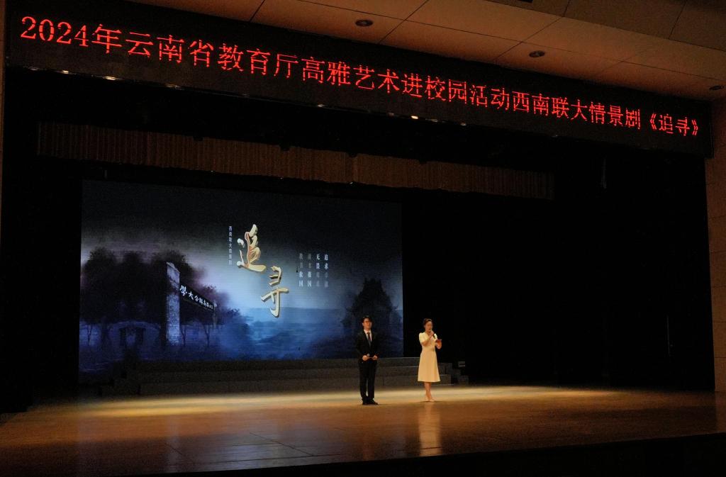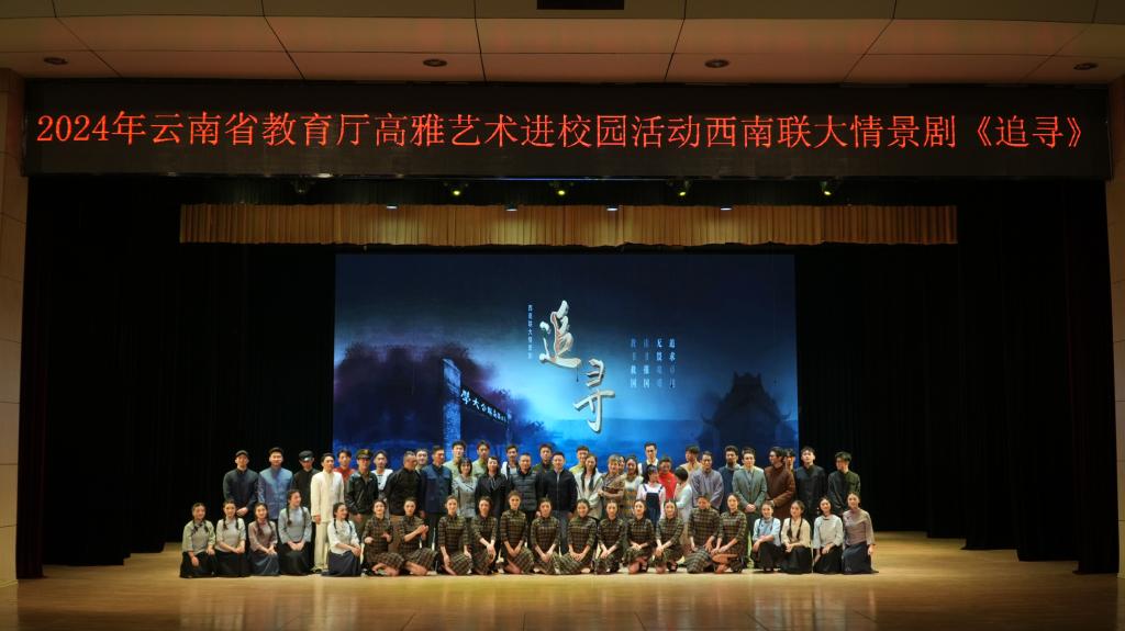 为进一步加强学校美育工作,强化美育育人功能,落实云南省教育厅关于开展2024年“高雅艺术进校园”活动的通知要求,11月19日,西南联大情景剧《追寻》在beat365官网学生会堂成功举办。此次活动由云南省教育厅主办,云南师范大学、beat365英国官方网站承办。云南师范大学传媒学院相关负责人,学校宣传部、学工部、团委等部门负责人及二级学院党委副书记、师生代表参加本次观演活动,观演人数达到1300人次。