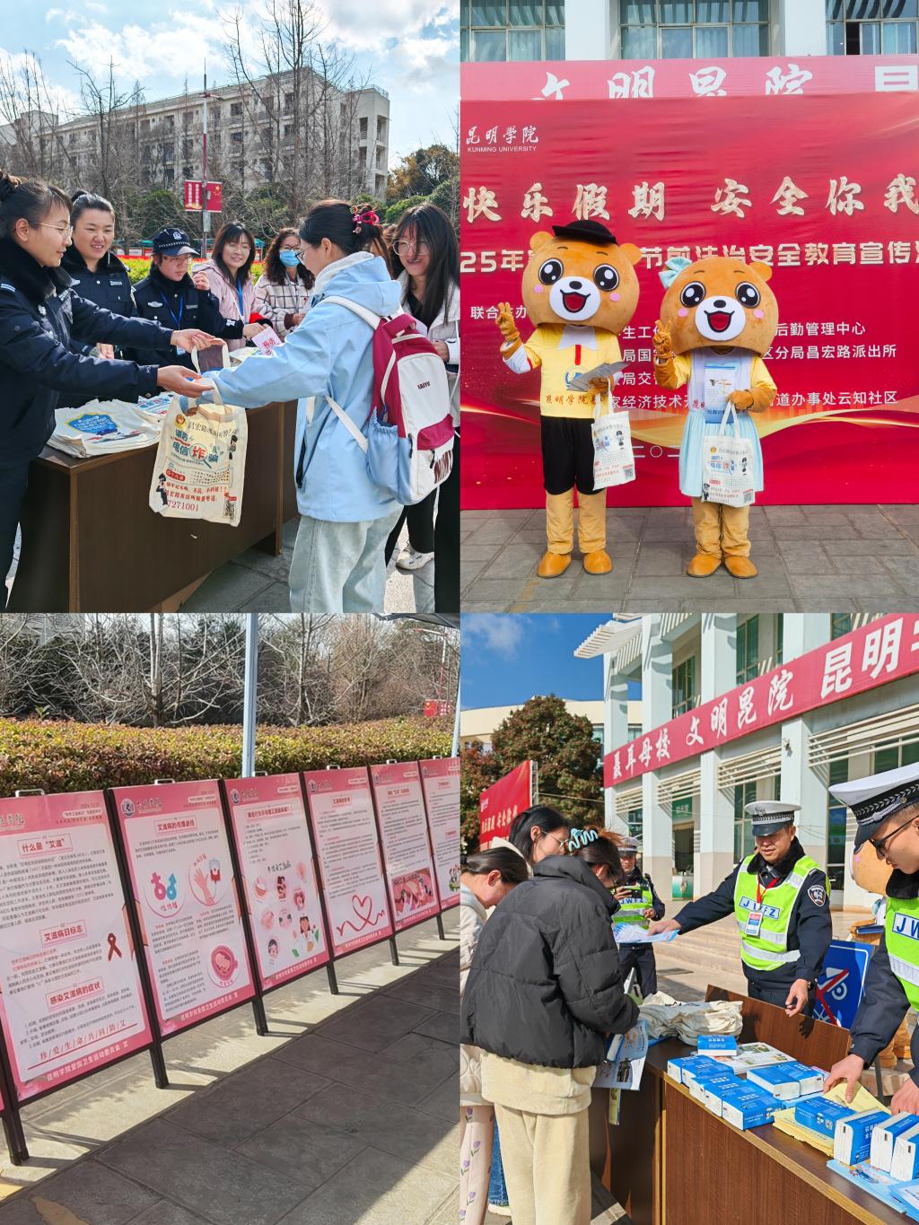 1月8日上午,保卫处、学生处、后勤管理中心联合交警七大队、昌宏路派出所、阿拉街道办事处及云知社区,在澄明苑食堂前举行beat365英国官方网站“快乐假期 安全你我”2025年寒假、春节法治安全教育宣传活动。