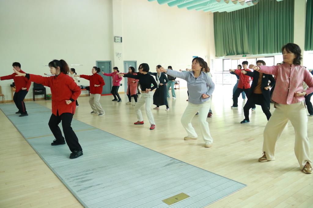 在体育舞蹈室,教师们在专业教练的带领下学习八段锦。八段锦作为中国传统养生功法,动作舒缓优美,简单易学,具有强身健体、修身养性的功效。伴随着悠扬的音乐,大家舒展筋骨,调整呼吸,在一招一式中感受着中华传统养生文化的博大精深。