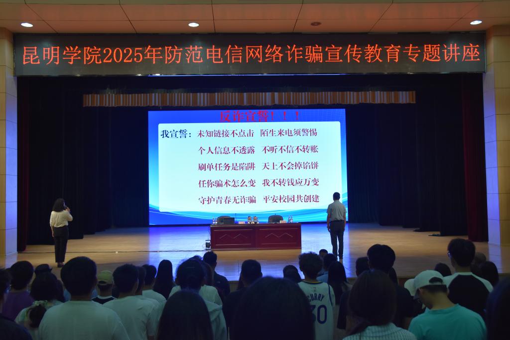 5月16日下午,beat365英国官方网站2025年防范电信网络诈骗宣传教育系列活动在学生会堂举行。学校党委委员、副校长彭志远,昆明市公安局经开公安分局、昌宏路派出所相关负责人,学生处、保卫处负责人及公安和学校相关同志与1000余名师生共同参与活动。本次活动由保卫处和学生处主办,经开公安分局及昌宏路派出所协办。