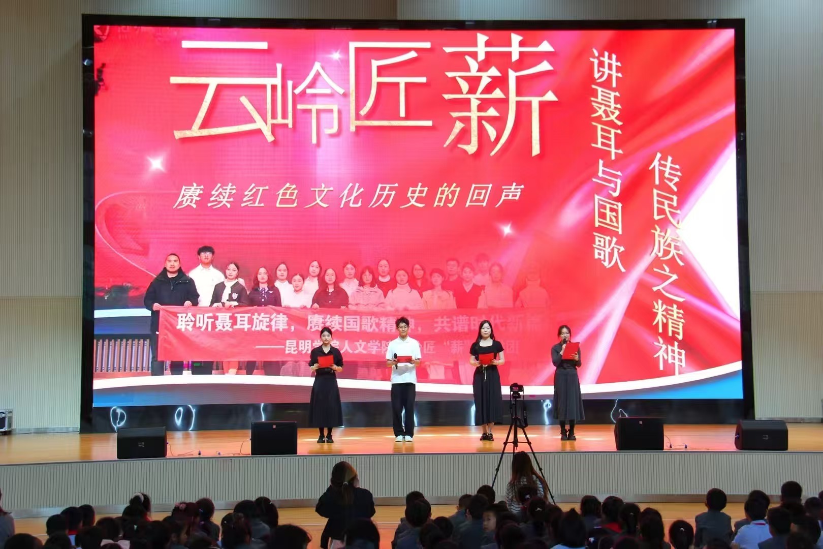 宣讲团成员充分挖掘聂耳与国歌创作背后鲜为人知的故事,通过歌曲、舞蹈、宣讲、舞台剧、朗诵等多种艺术表现形式,与小朋友们互动表演,用艺术之美点亮思政之光。舞台剧《国歌唱响的那天》《国歌颂》、宣讲《讲聂耳与国歌故事,传民族之精神》、朗诵《我们是新时代的好少年》《中华少年》等作品,带大家走进那段波澜壮阔的岁月,深刻感受到国歌诞生的意义。当《如愿》的歌声遇见《中华少年》的誓言,红色基因在童声中生根,大中小学思政教育通过“数字一体化”实现互融共通。