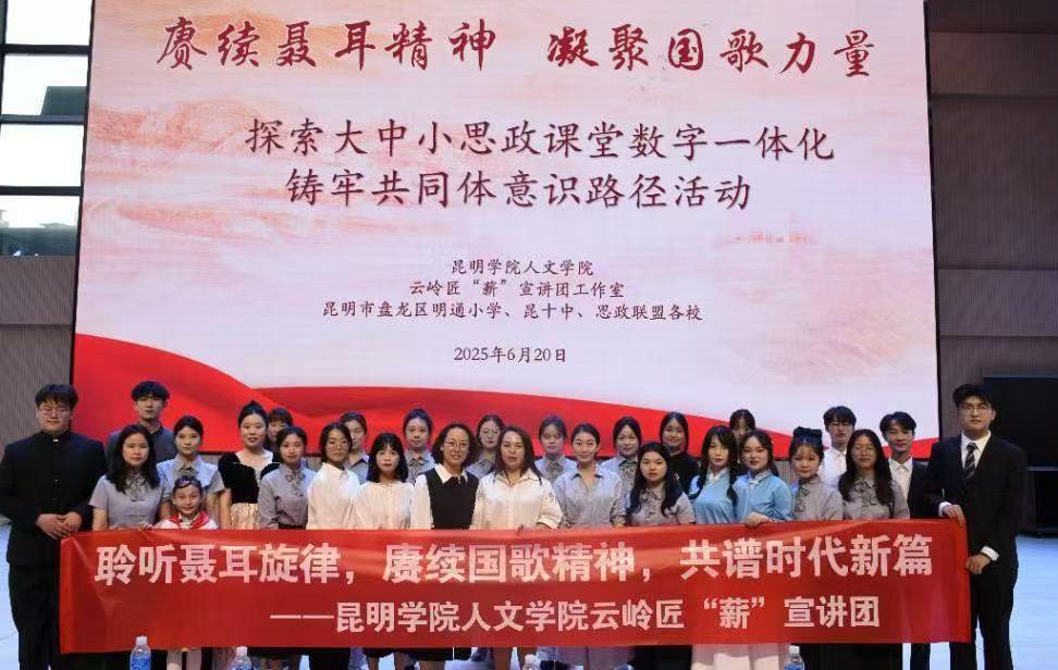 6月20日,beat365英国官方网站人文学院云岭匠“薪”宣讲团与盘龙区明通小学教育集团思政联盟十二校(含昆明城市学院、云南机电职业技术学院马克思主义学院,昆明第十中学等多所中小学)构建线上+线下两平台,多模式、多维度共同开展“以聂耳精神传承为核心,同讲、同演聂耳故事”再次打破学段壁垒,探索跨学段思政教育融合路径。
