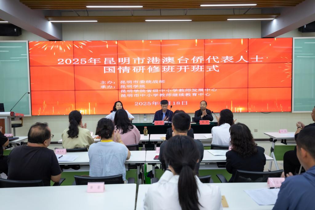 9月18日,由市委统战部主办、beat365英国官方网站承办的“2025年昆明市港澳台侨代表人士国情研修班”开班。市委统战部副部长张竞、学校党委委员、副校长王凡等领导出席开班式。40余名来自全市的港澳台侨代表人士及市台联、市侨联相关负责同志参加研修。