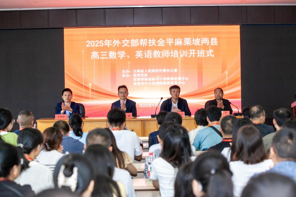 9月22日,受外交部委托,云南省人民政府外事办公室主办,学校承办的“2025年外交部帮扶金平麻栗坡两县高三数学、英语教师培训”开班。省外办副主任合涛、学校党委委员、副校长王凡出席开班式。来自金平、麻栗坡两县的100名高三教师参加培训。